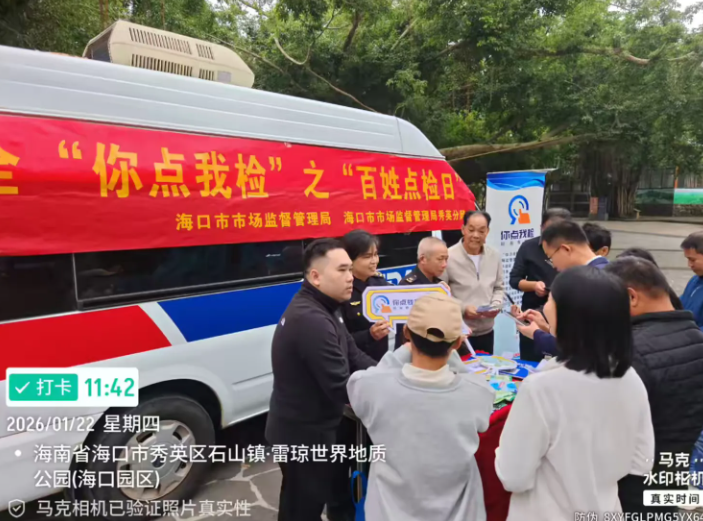 春节前夜,为进一步提拔食物抽检工做参取度,加强人平易近群众对年货食物平安的获得感和对劲度,营制食物平安社会共治共享款式,2026年1月22日,海口市市场监视办理局正在区火山口地质公园开展年货购食物平安“你点我检”之“苍生点检日”宣传勾当。