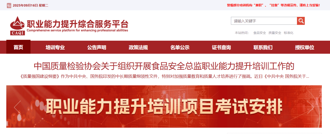 第一步:正在旅逛器输入进入 中国质量查验协会官网,或者百度搜刮“中国质量检 验协会”进入官网。第二步:官网页面下滑点击“职业 能力提拔培训栏目” ,进 入职业能力提拔分析办事平台。